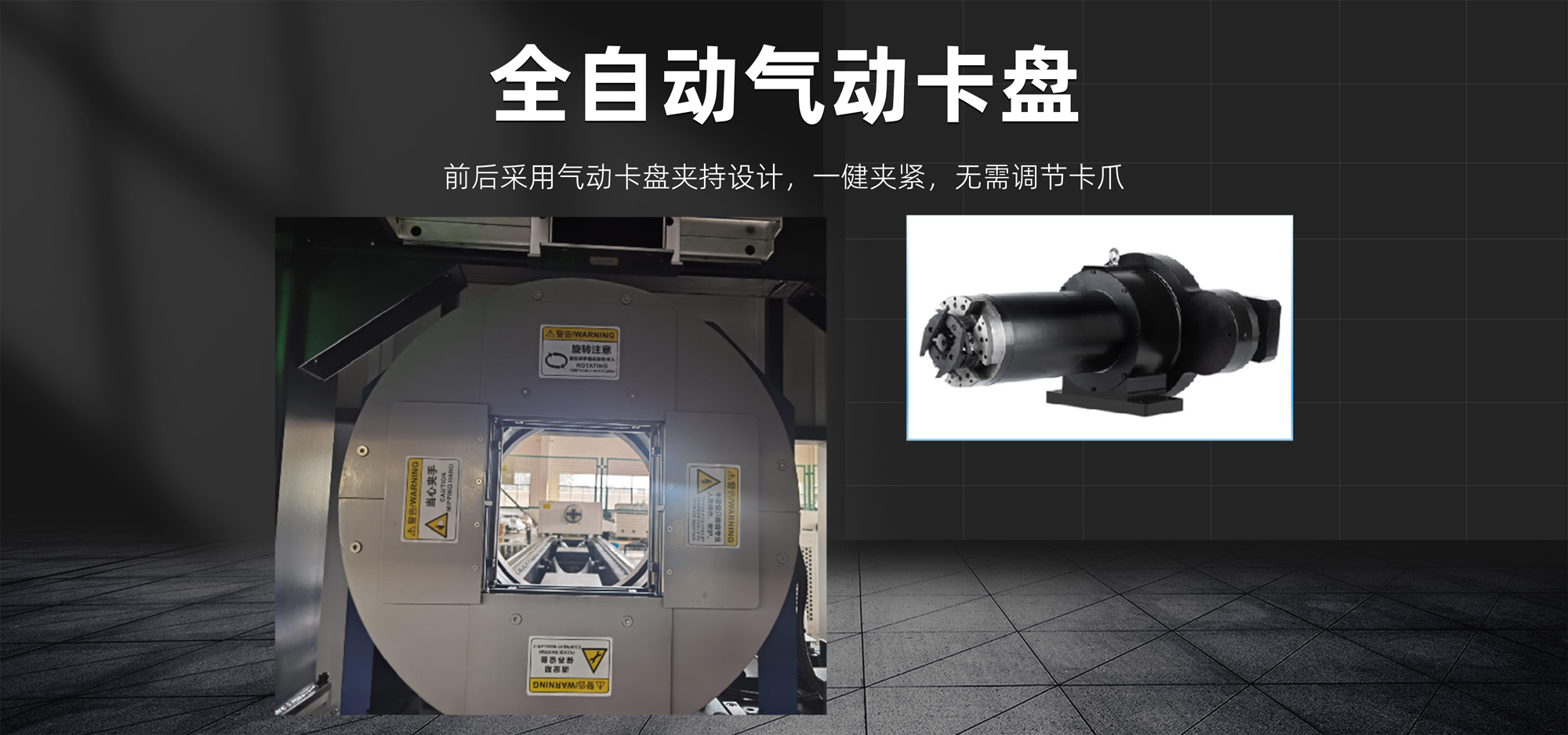 前后采用氣動(dòng)卡盤(pán)夾持設(shè)計(jì),一鍵夾緊,無(wú)需調(diào)節(jié)卡爪